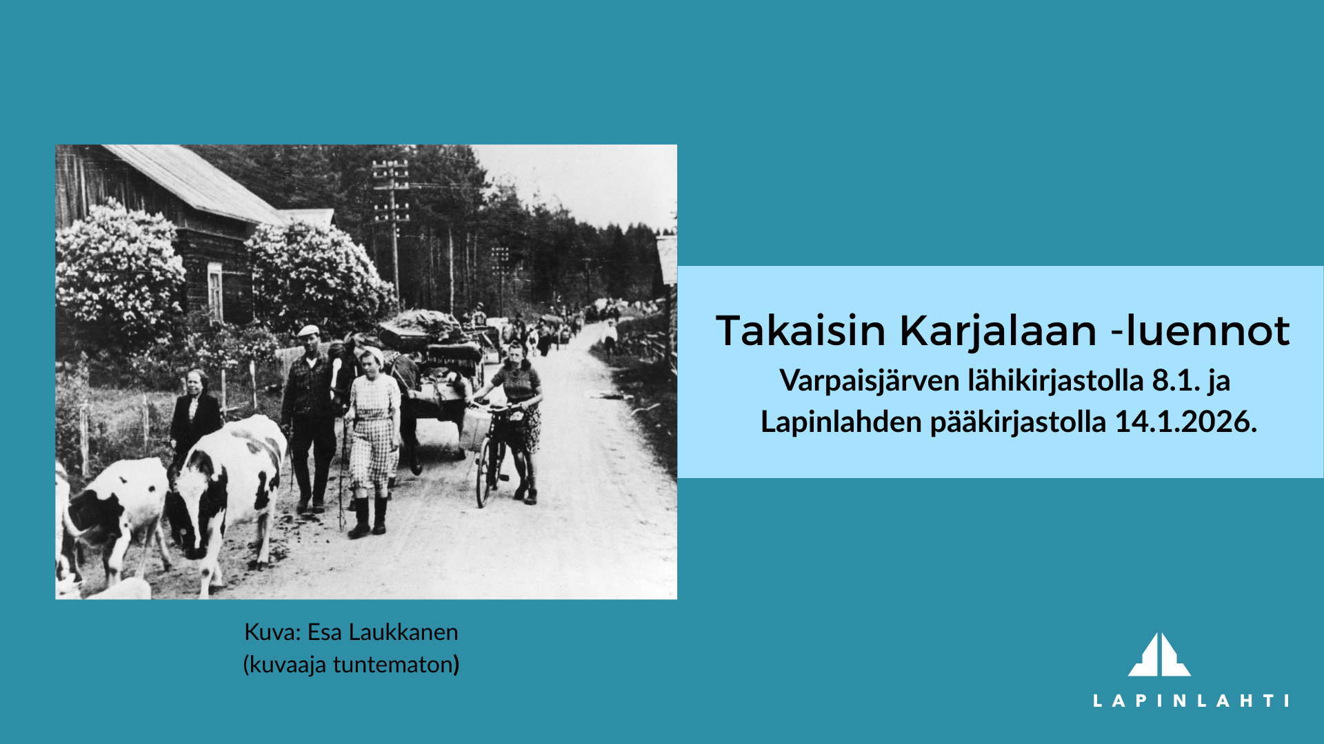 29.12.2025 Sotahistorianharrastaja Esa Laukkanen luennoi Varpaisjärvellä ja LapinlahdellaTilaisuudet järjestetään Varpaisjärven lähikirjastossa ja Lapinlahden pääkirjastossa. Tilaisuuksiin on vapaa pääsy, ja ennen luentoa kahvitarjoilu.