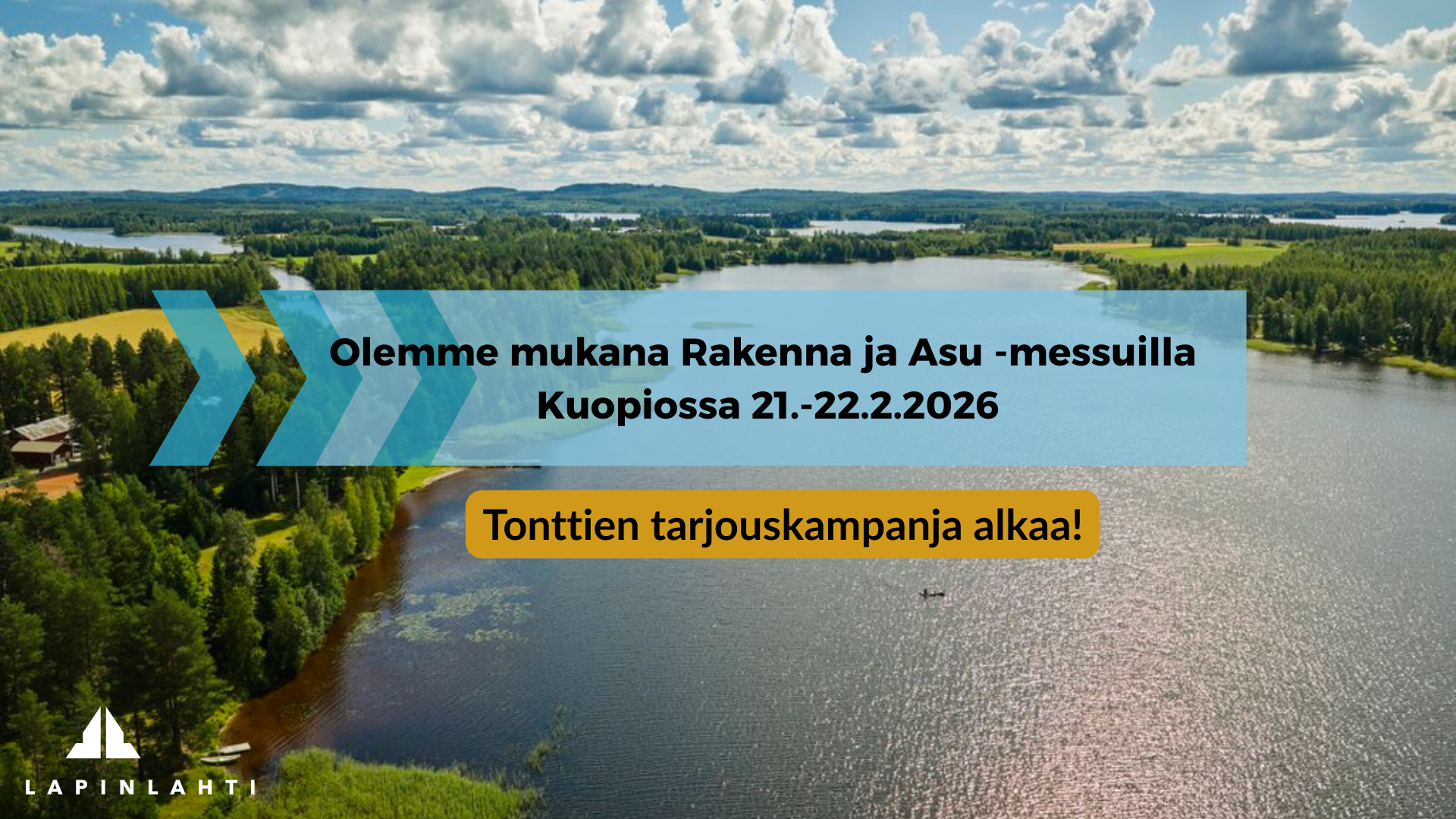 Julkaistu 5.2.2026 Lapinlahden kunta on mukana Rakenna ja Asu -messuilla Messut järjestetään Kuopio-hallissa 21.-22.2.2026. Löydät meidät osastolta F-2. Lapinlahden talotonttien tarjouskampanja käynnistyy ensimmäisenä messupäivänä. -