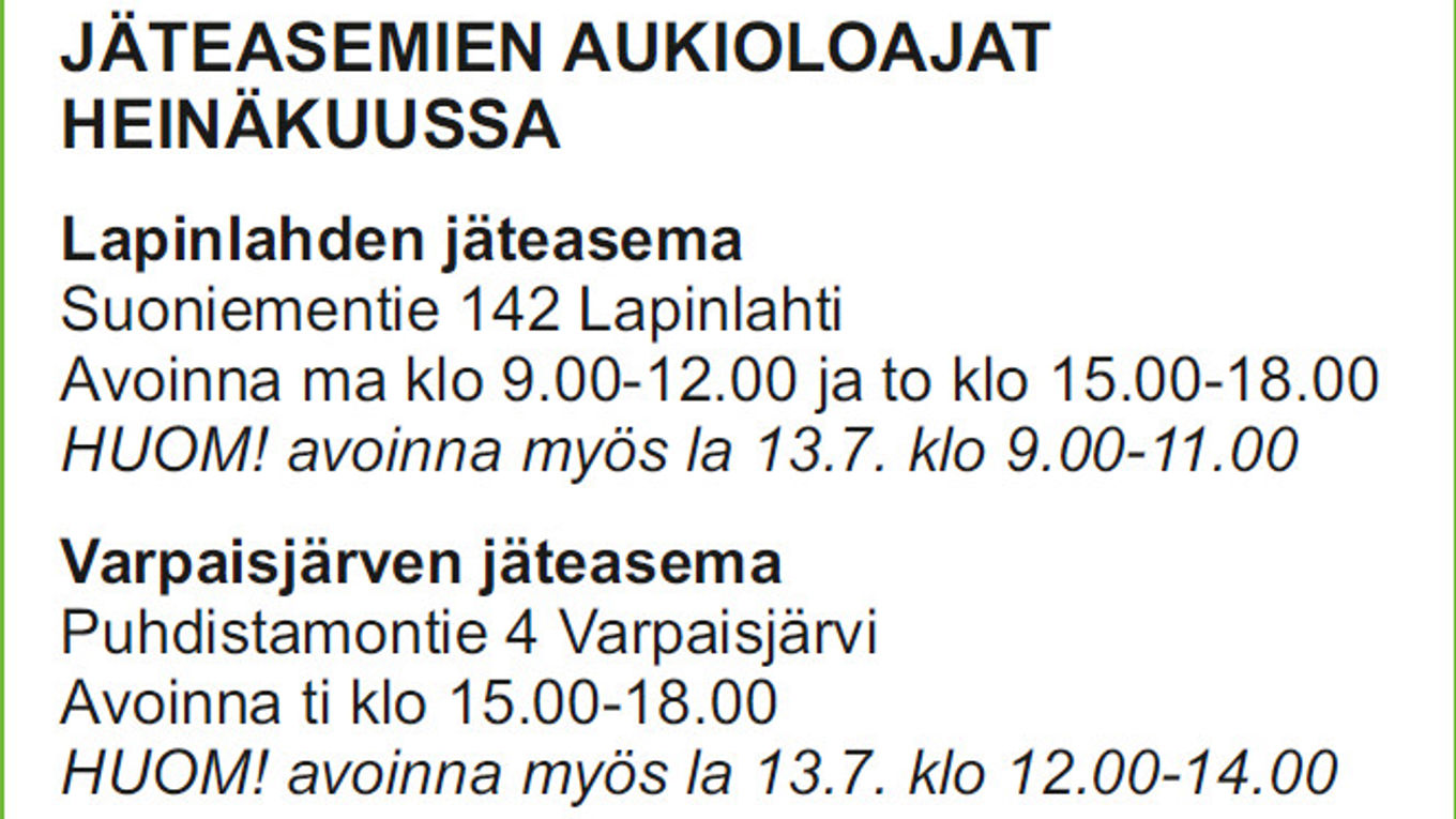 Lapinlahden ja Varpaisjärven jäteasemien aukioloajat heinäkuussa