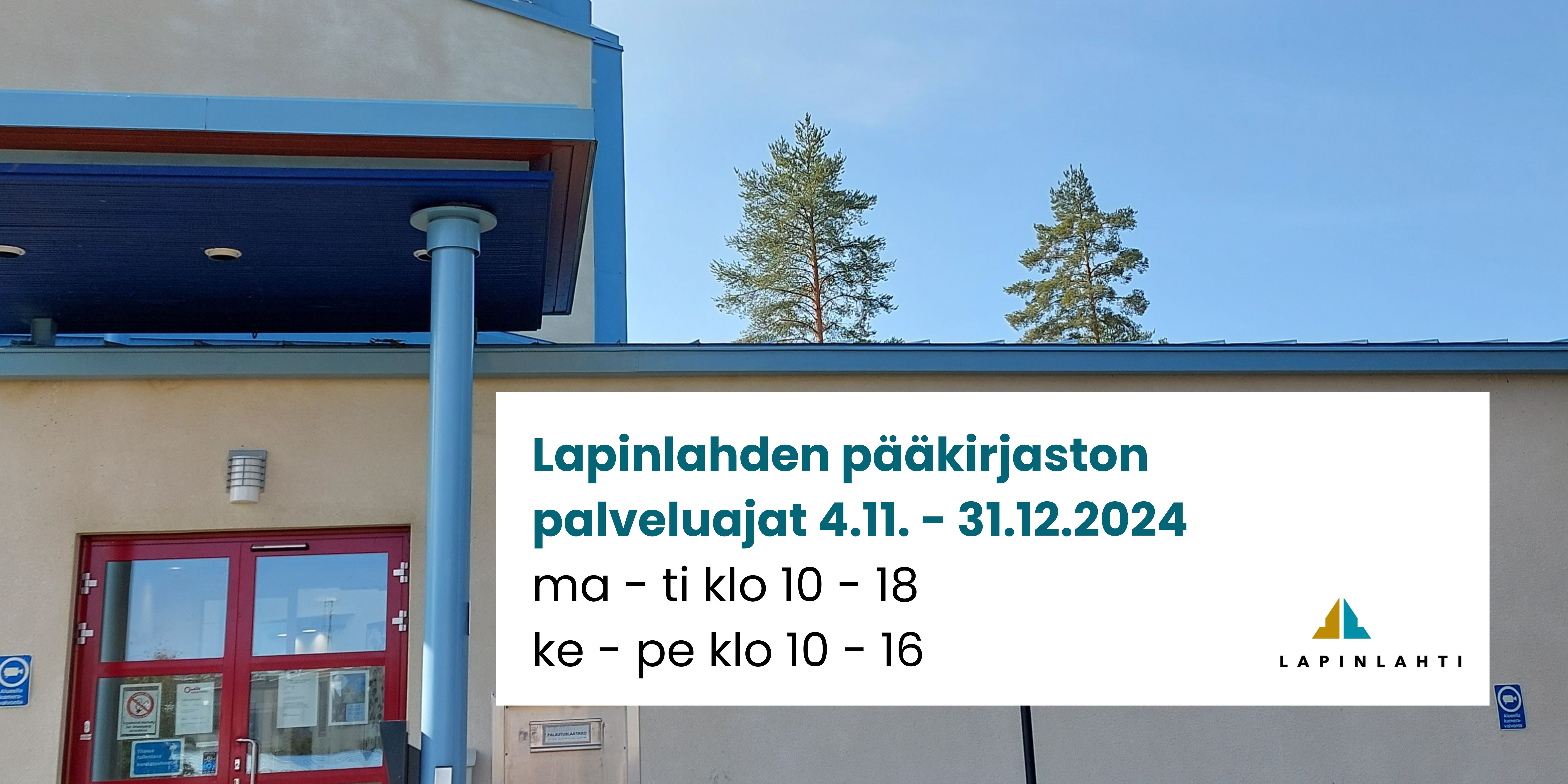 Huomioithan, että Lapinlahden pääkirjaston henkilökunnan palvelujat ovat 4.11. -31.12.2024 ma - ti klo 10 - 18 ja ke - pe klo 10 - 16.