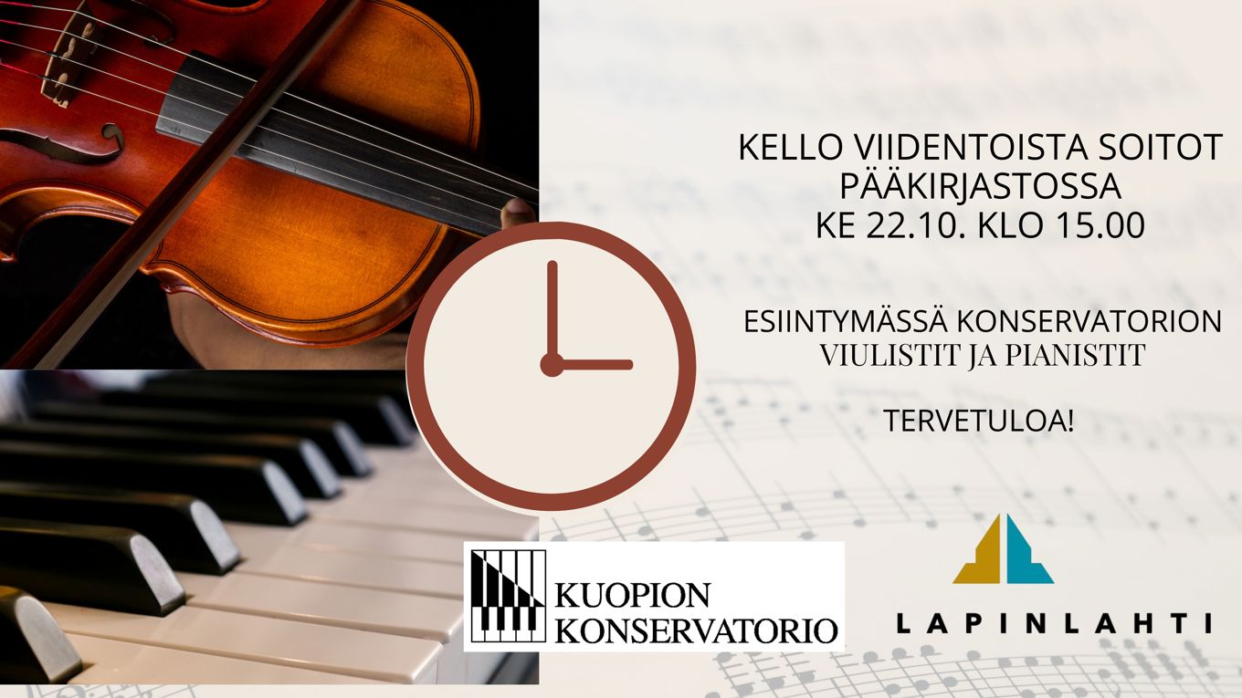 Kello viidentoista soitoissa Lapinlahden pääkirjastolla 22.10. klo 15 esiintyvät Kuopion konservatorion Lapinlahden toimipisteen piano- ja viuluoppilaat.