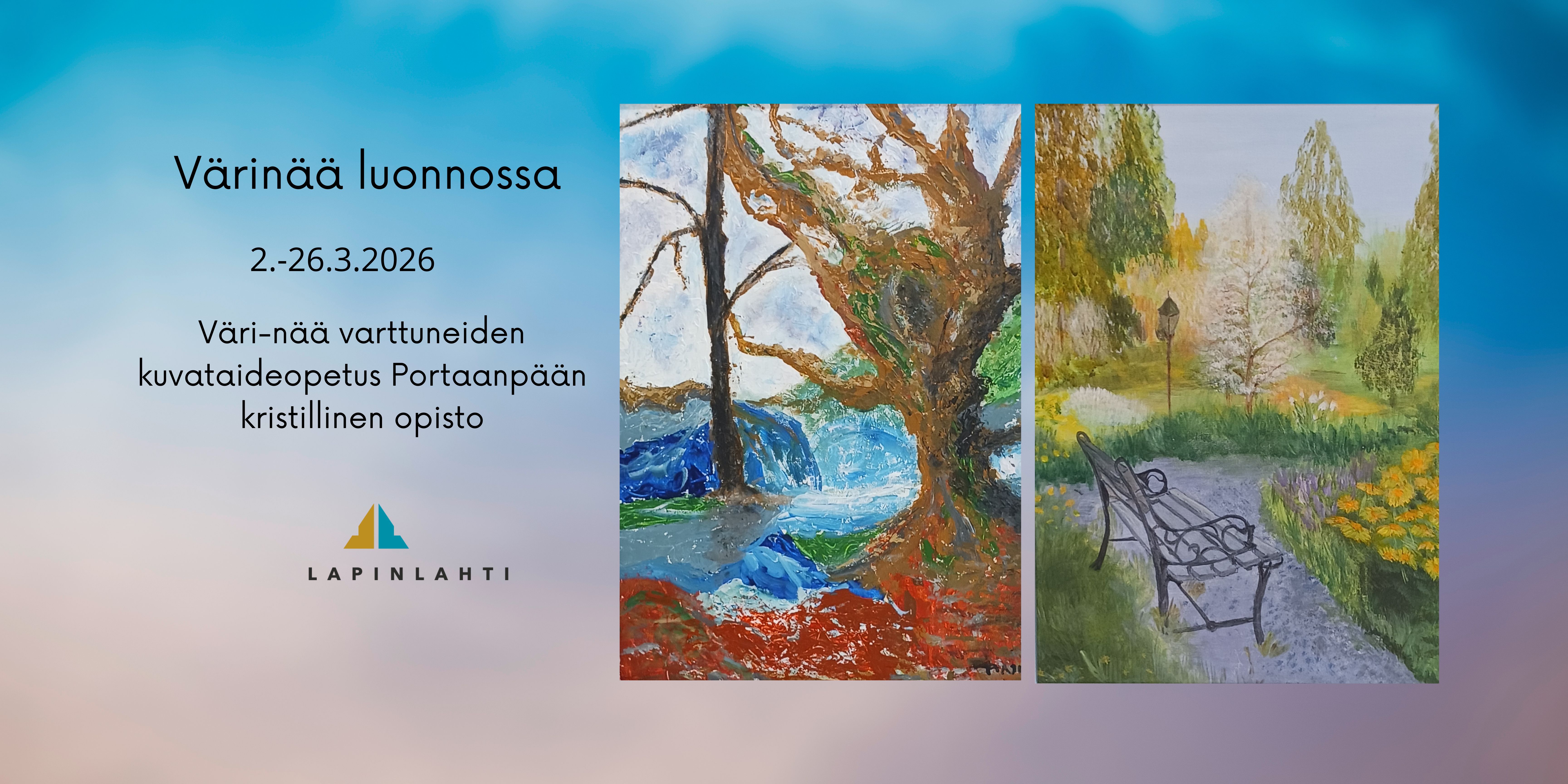Portaanpään kristillisen opiston Väri-nää varttuneiden kuvataideopetuksen taidenäyttely Värinää luonnossa Lapinlahden pääkirjaston näyttelytila Aniarassa 2.-26.3.2026.