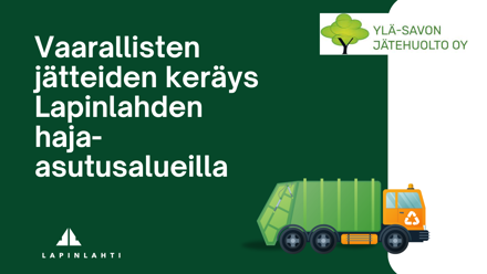 Julkaistu 1.10.2025 Vaarallisten jätteiden keräys haja-asutusalueilla Ylä-Savon Jätehuolto Oy ja NG Nordic Finland Oy järjestävät vaarallisten jätteiden keräykset Lapinlahden haja-asutusalueilla tiistaina 7.10. ja keskiviikkona 8.10. -