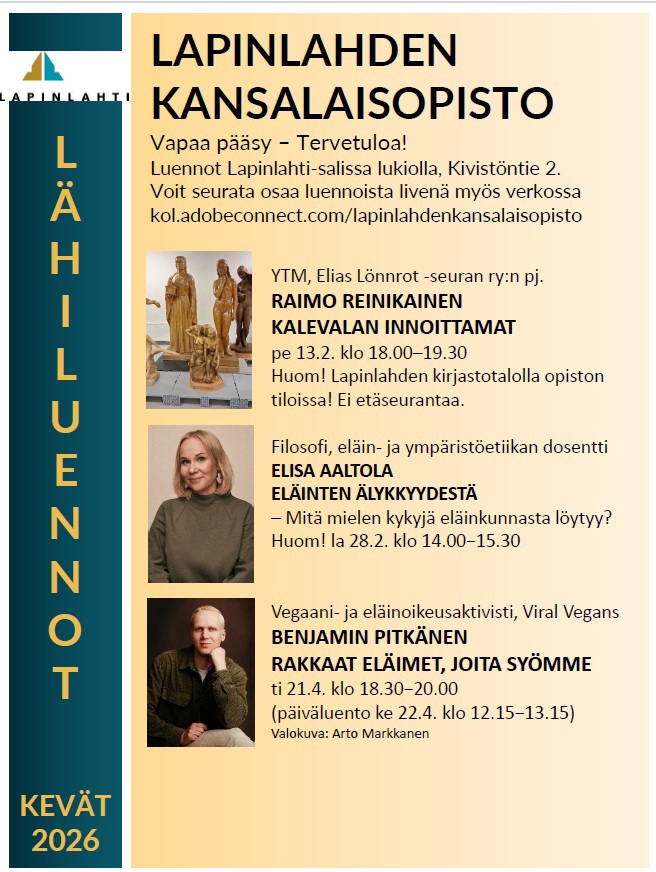 Jos et pääse paikalle, voit seurata ja kommentoida luentoa livenä myös verkossa osoitteessa kol.adobeconnect.com/lapinlahdenkansalaisopisto. Vapaa pääsy − Tervetuloa!