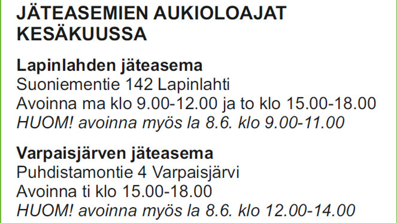 Lapinlahden ja Varpaisjärven jäteasemien aukioloajat kesäkuussa