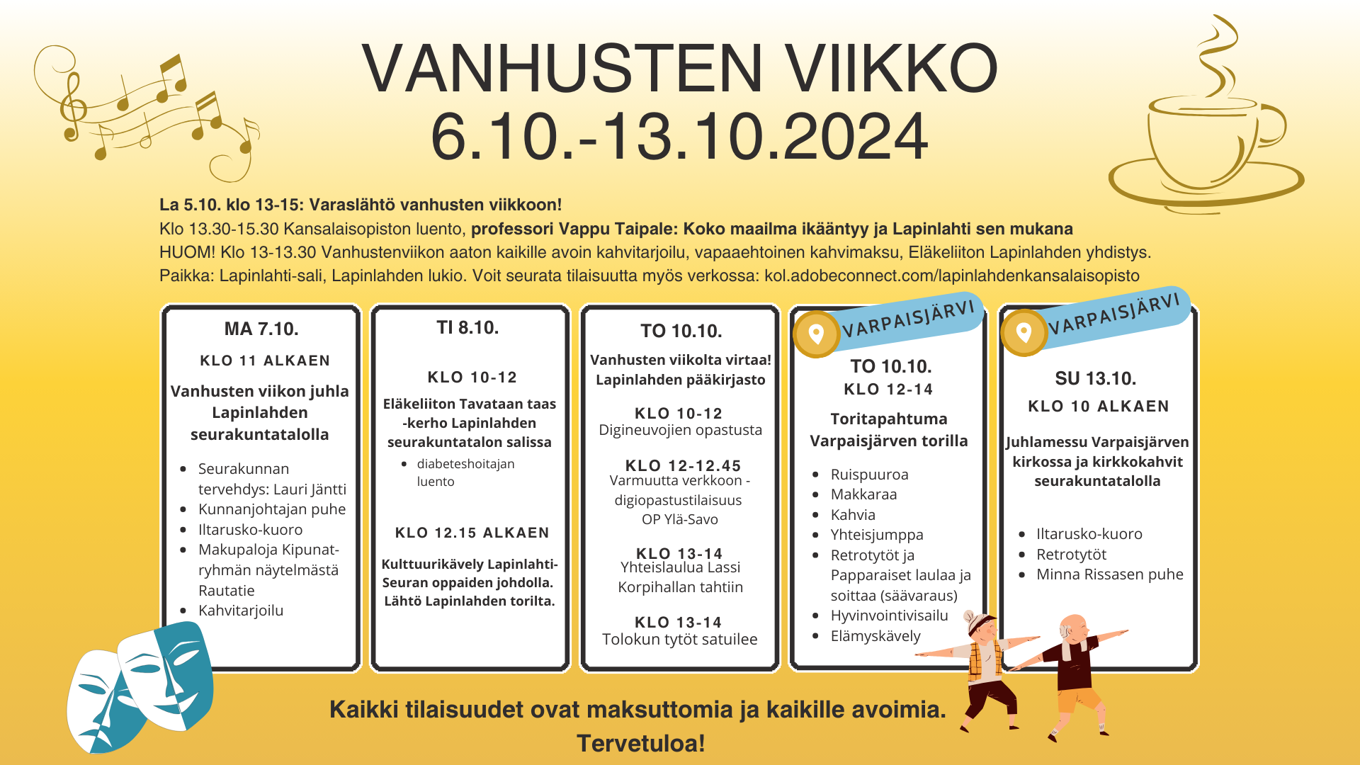 - HUOM! Klo 13-13.30 Vanhustenviikon aaton kaikille avoin kahvitarjoilu, vapaaehtoinen kahvimaksu, Eläkeliiton Lapinlahden yhdistys.