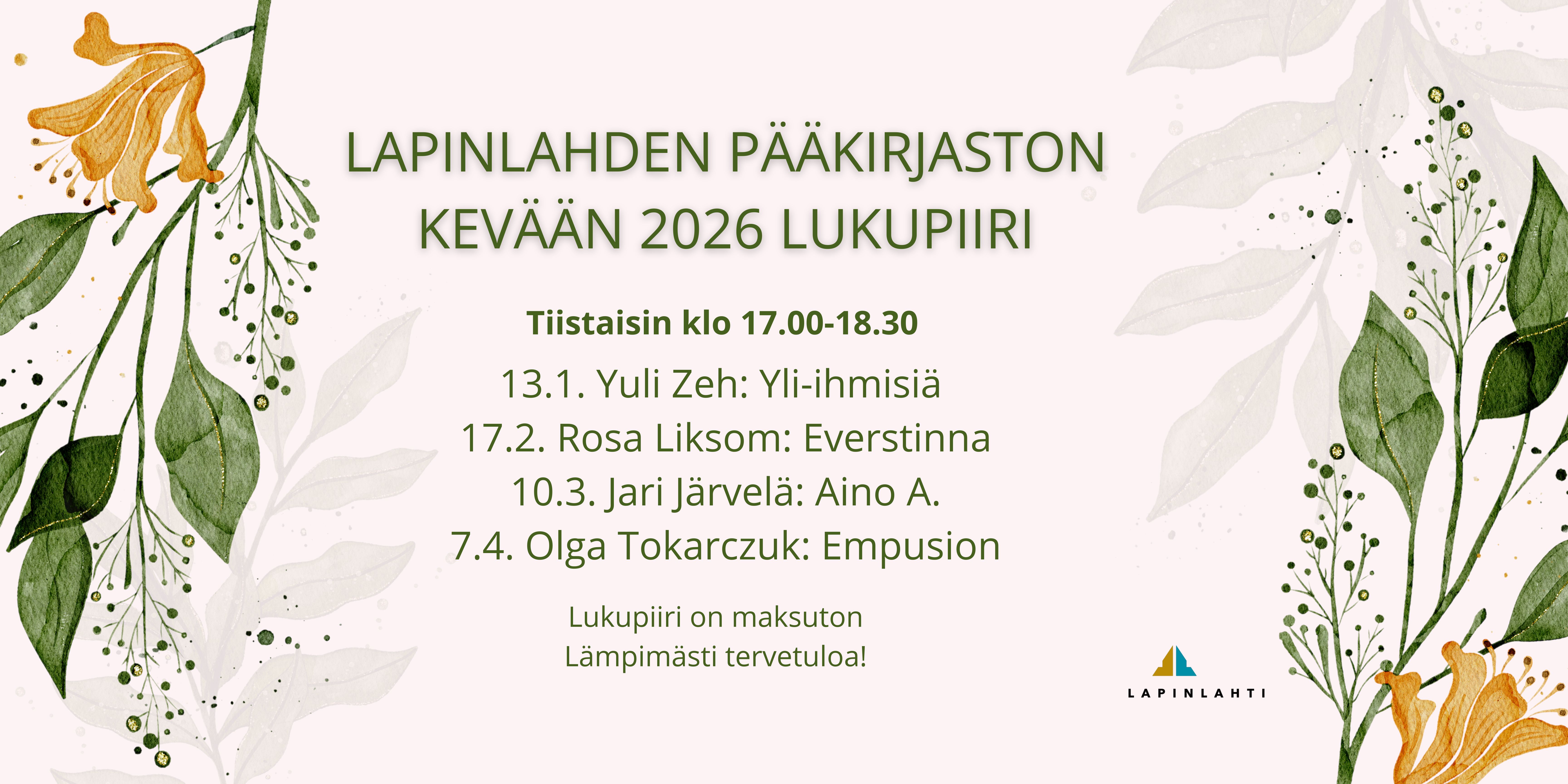 Lapinlahden pääkirjaston kevään 2026 lukupiiri