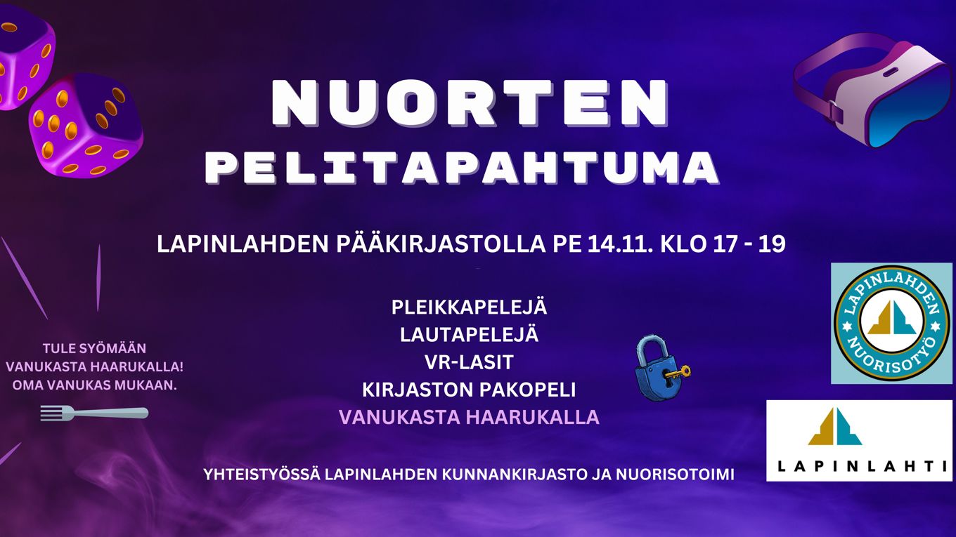 Ohjelmassa lautapelejä, pleikkapelejä, vr-lasit ja kirjaston pakopeli. Syödään yhdessä vanukasta haarukalla (ota oma vanukas mukaan).