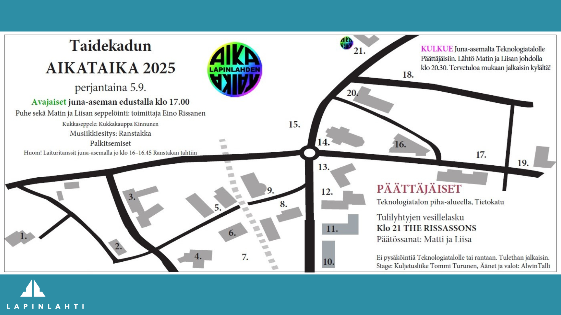Kymmenestä AIKATAIKA-pisteestä saat AIKATAIKA-leiman. Kerää kuusi leimaa ohjelmakartan kääntöpuolelle. Voit osallistua arvontaan kertaalleen lisäämällä karttaan nimesi ja puhelinnumerosi. Palauta leimattu kartta johonkin leimapisteistä AIKATAIKA-iltana. Kymmenen arvotun voittajan nimet julkaistaan Lapinlahden kansalaisopiston Facebookissa, Matissa ja Liisassa 11.9., ja voitoista ilmoitetaan myös henkilökohtaisesti. Palkinnot sponsoroivat Grilli Hyvä Eväs, Matin ja Liisan Asema, Väärninsaaren Ystävät ja Lastu.